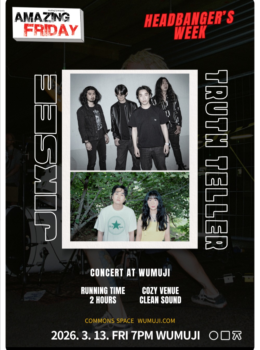 혼란한 세상을 똑바로 바라보는 직시와 그 안의 진실을 노래하는 트루스 텔러가 만나 가장 정직하고 뜨거운 에너지를 터뜨립니다. 가식 없는 진실의 소리에 몸을 맡기고 함께 머리를 흔들며, 일상의 갈증을 해소하는 경이로운 금요일 밤을 만끽해 보세요.